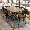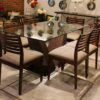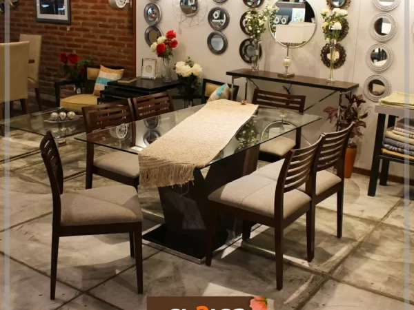 Posee vidrio templado, base cromada y tronco de madera en forma de V.