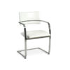 Silla con apoyabrazos de estructura metálica cromada, respaldo de madera lustrado y asiento tapizado. Su diseño impecable y armonioso la hace adaptable a diversos ambientes como comedores u oficinas.